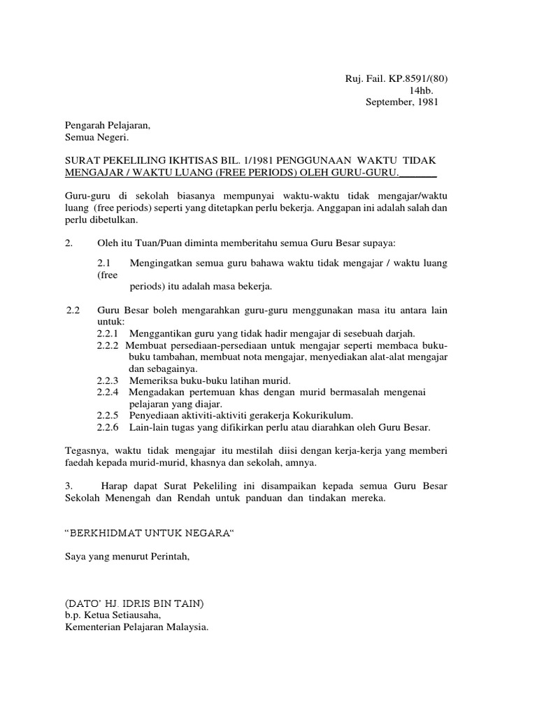 Web Sebenarnya pada tahun 1981 telah dikeluarkan Surat Pekeliling Ikhtisas Bil 31981 Penggunaan Waktu Tidak MengajarWaktu Luang Free Period Oleh Guru. Pegawai Perhubungan Awam Kementerian Pelajaran Malaysia Dokumen ini diilustrasi kembali daripada salinan asal LAMPIRAN 2 SENARAI TUGAS GURU PERPUSTAKAAN DAN MEDIA. Jumlah waktu mengajar ini hanyalah sebagai rujukan dan panduan.
